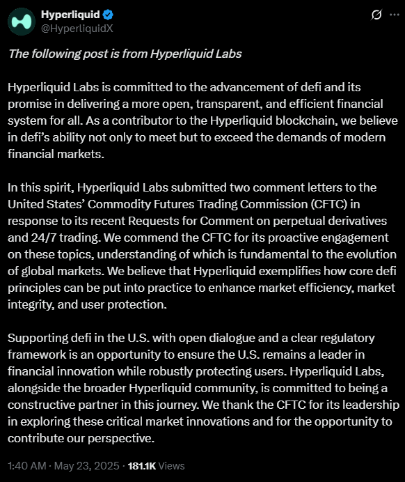 Hyperliquid has sent two comment letters to the US Commodity Futures Trading Commission (CFTC) addressing the agency’s inquiries into perpetual derivatives and 24/7 trading. The layer-1 blockchain network, which specializes in low-latency trading, sought to highlight how decentralized finance (DeFi) can improve market structure and user protections. The move comes as CFTC Commissioner Summer Mersinger signals that perpetual crypto futures may soon gain US regulatory approval for the first time.