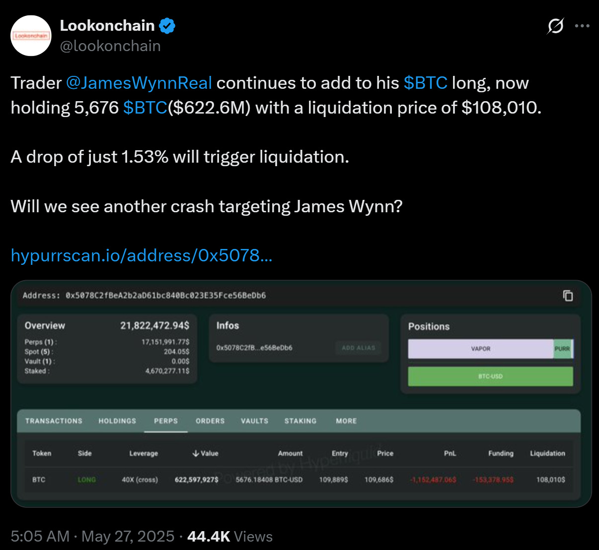 Cryptocurrency trader James Wynn has doubled down on Bitcoin, adding to his 40x leveraged long position on Hyperliquid, according to data from Lookonchain. His position is now worth roughly $620 million and faces liquidation if Bitcoin’s price drops by just over 1.5% to around $108,000, the data shows.