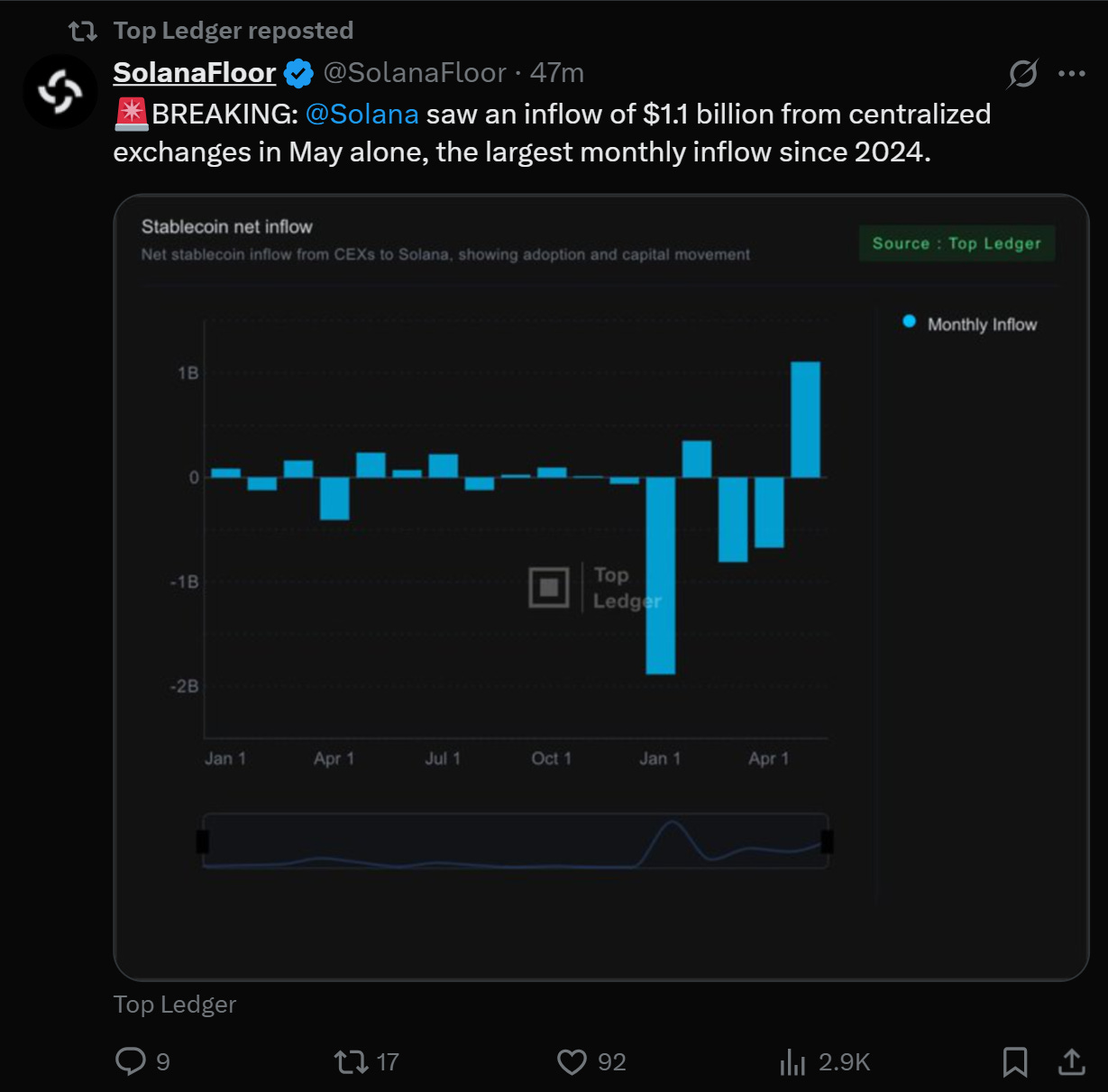 The Solana network drew approximately $1.1 billion from centralized exchanges during the month of May, the highest monthly net inflow figure so far this year and a stark reversal from January, according to data from Top Ledger.