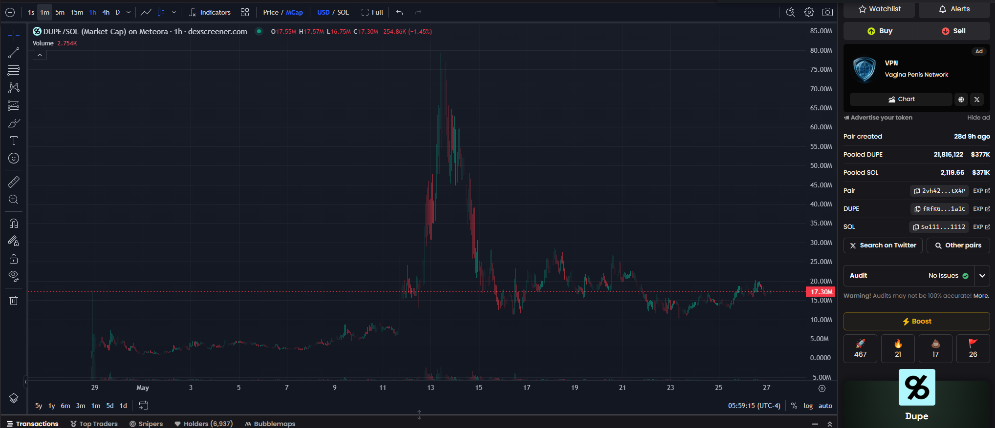 By May 13, the DUPE token tapped an all-time high market capitalization of nearly $80 million, according to data from DexScreener. It trades at a market cap of nearly $17 million as of May 27, the data shows.