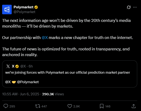 Polymarket and X.com clinched a partnership deal Friday designed to integrate data from the Web3-based prediction marketplace into Elon Musk’s social media platform, X.com said in an announcement shared with Hyperstition.