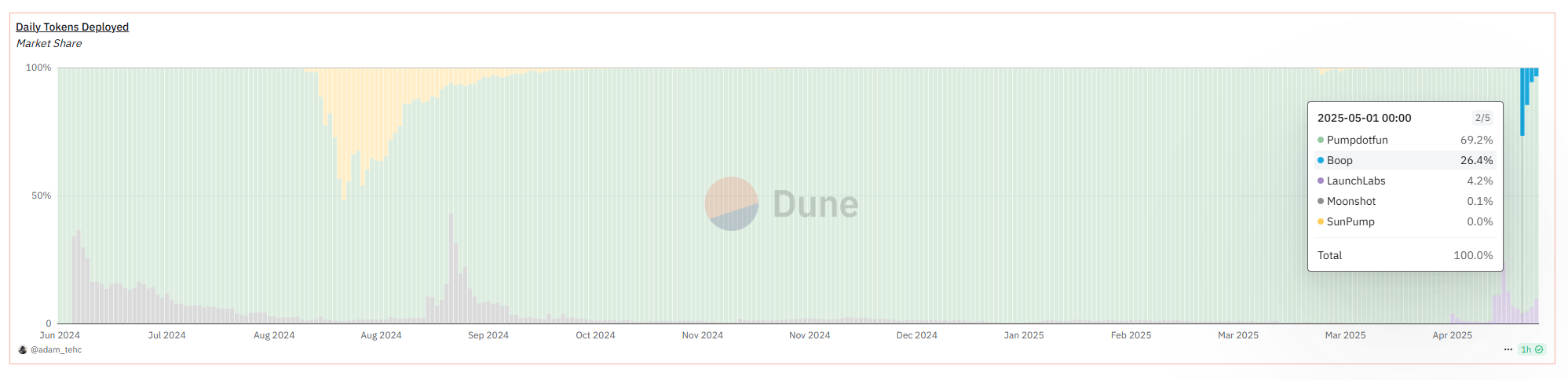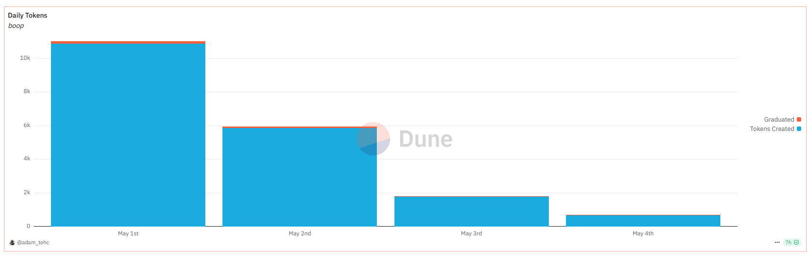 But activity on the platform has subsequently dwindled. As of May 4, Boop launched around 1,100 coins, per Dune. Its market share now stands at some 3%.