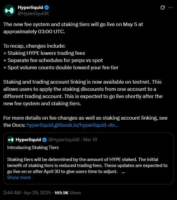 On May 5, Hyperliquid is rolling out a staking upgrade designed to reward stakers with lower trading costs while increasing the DEX’s overall fee revenues. Check out Hyperstition’s May 2 issue for a detailed breakdown.