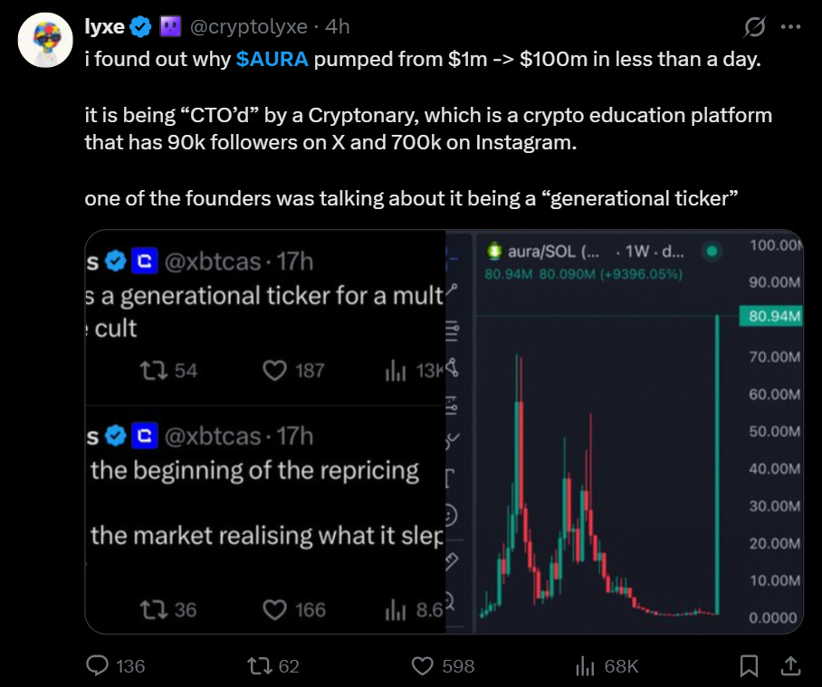 Starting on June 10, aura (aura), a year-old utility token tied to an eponymous InfoFi project, surged from a roughly $1 million to nearly $100 million market cap in under 24 hours. The pump was allegedly orchestrated by KOLs affiliated with the Cryptionary platform. It has since inspired several derivative coins, including the void (void) and aurification (aura).