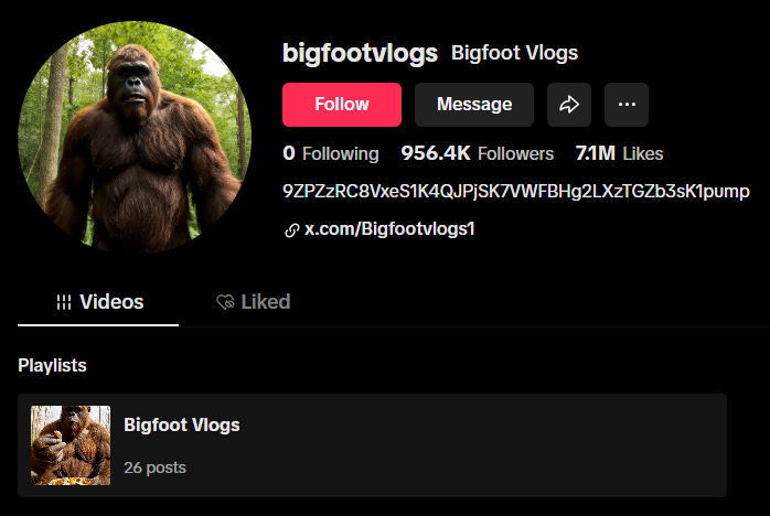 On June 8, the original Bigfoot Vlogs (Bigfoot) token, unaffiliated with the TikTok account, reached a nearly $3 million market capitalization after Google Labs shared a video on X featuring the AI-generated character.