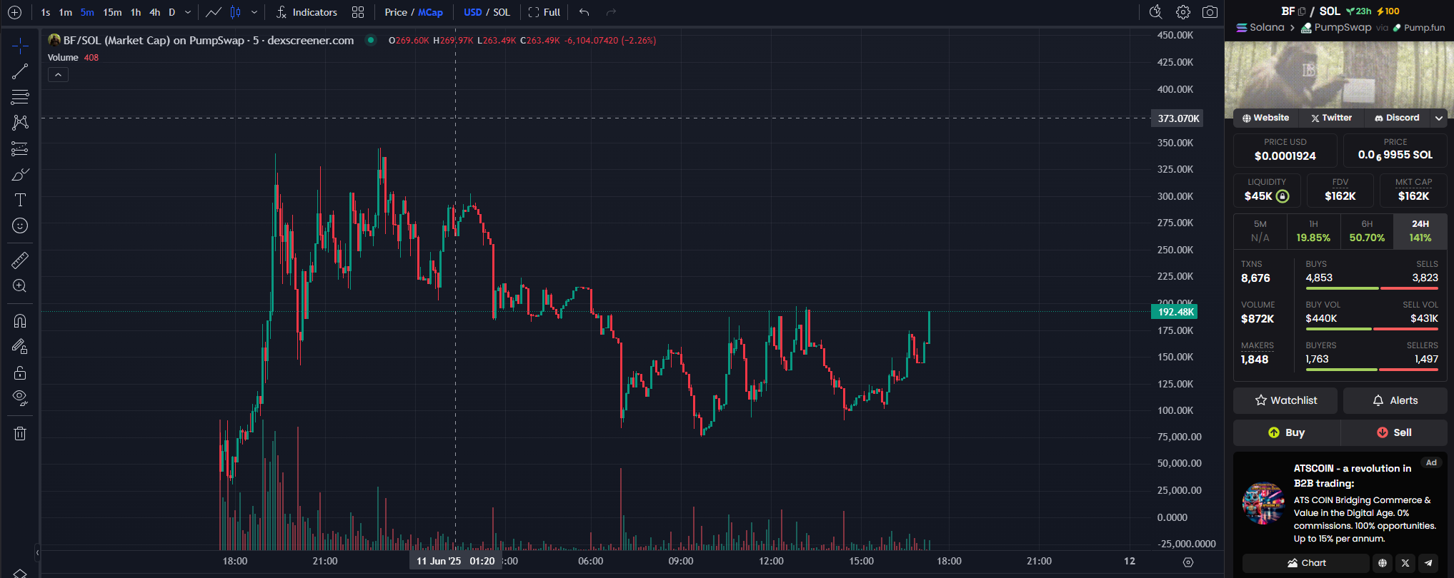 The official Bigfoot coin peaked around $350,000 shortly after launch but has since retraced to approximately $150,000, according to DexScreener. The original Bigfoot token trades at a market cap of roughly $190,000 as of June 11, the data shows.