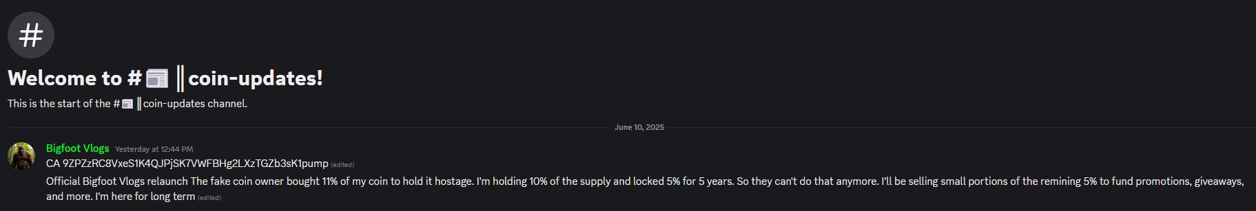 “The fake coin owner bought 11% of my coin to hold it hostage. I'm holding 10% of the supply and locked 5% for 5 years. So they can't do that anymore,” the Bigfoot Vlogs creator said, according to a June 10 Discord post.