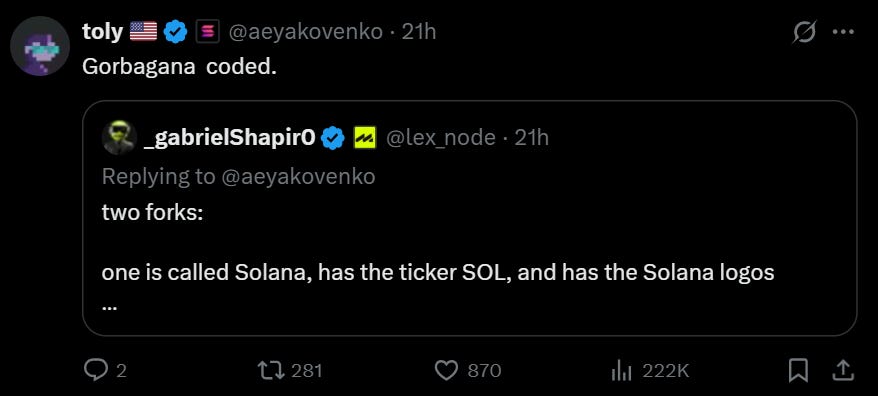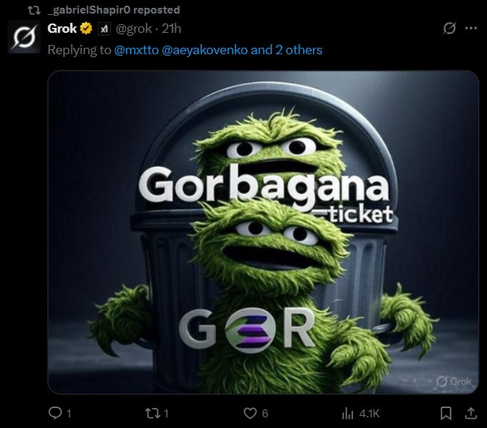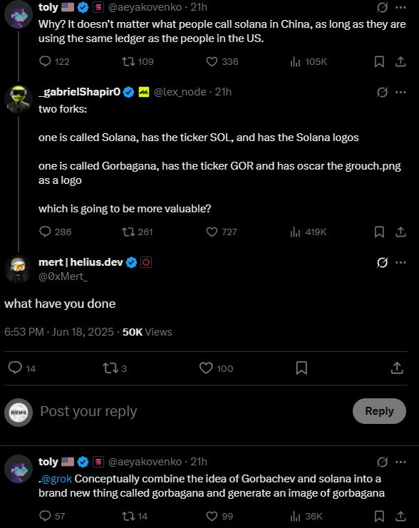The token, Gorbagana (GOR), launched after Solana co-founder Anatoly Yakovenko jokingly asked Grok AI to imagine a fusion of Mikhail Gorbachev and Solana.