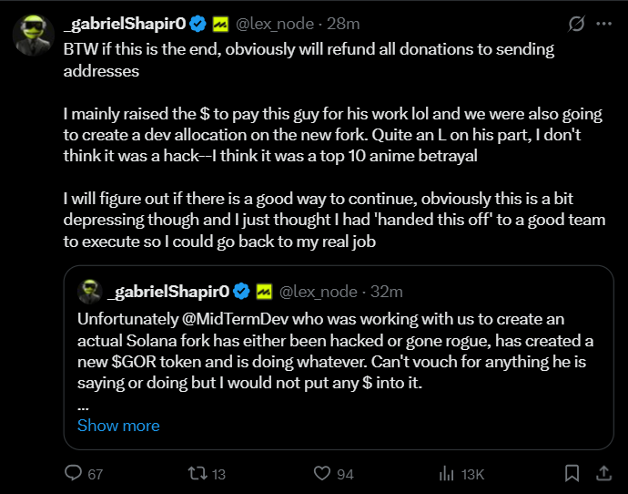 Shapiro alleged that a key developer, MidTermDev, had “gone rogue” — launching a new, unaffiliated GOR token and splintering the project.