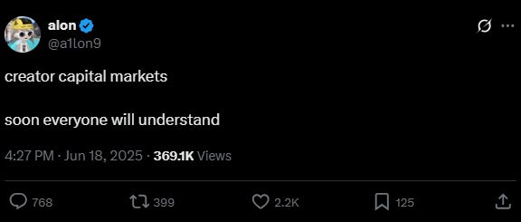 A legacy token called Creator Capital Markets (CCM), launched in May, also rallied this week after Pump.fun co-founder Alon used the phrase in a viral X post. The token jumped from $30,000 to over $1.2 million in market cap.