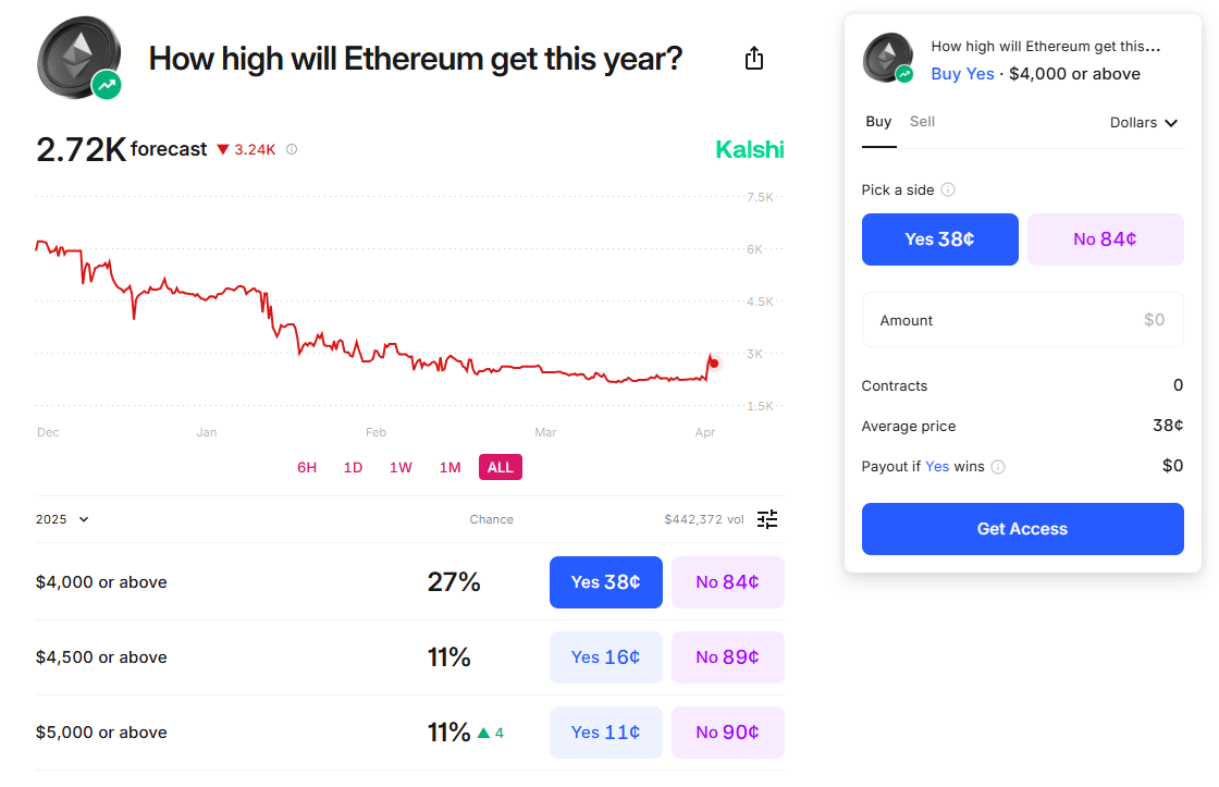 It’s not all bad news. Bettors on Kalshi expect Ether — the Ethereum network’s beleaguered native token — to rise to around $2700 per coin in 2025, a roughly 50% bump from its current price. They set the odds of a recovery past $4000 at more than 27%.