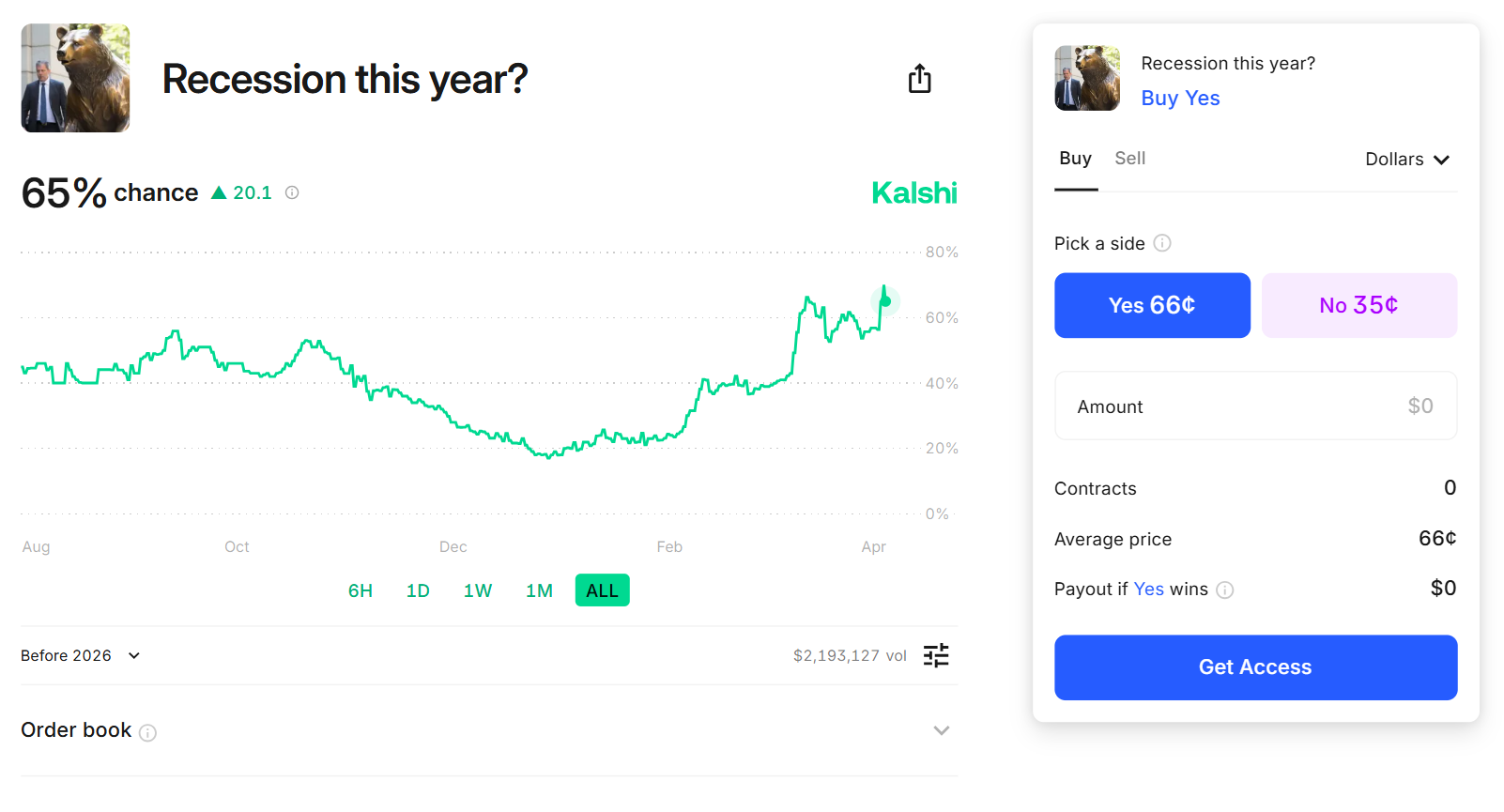 Now, Kalshi is forecasting a ~65% chance of the US entering a recession this year.